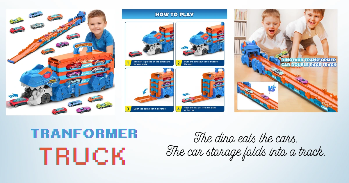 This toy is a total blast. It’s a big truck that converts into a racetrack, but the real "wow" factor is the "eating" action. When the kids push the truck over the little cars, it gobbles them up and stows them inside!
